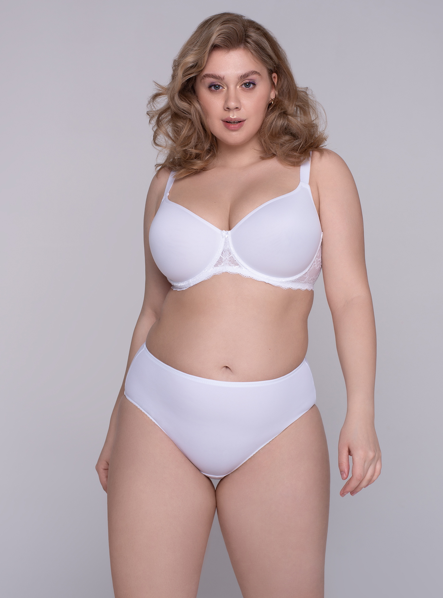 Формованный бюстгальтер на каркасах, центральная и боковые детали из эластичного кружева.