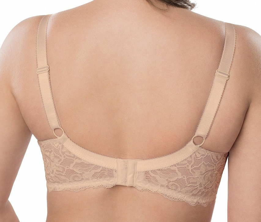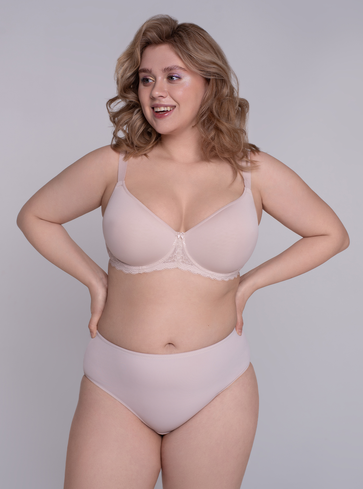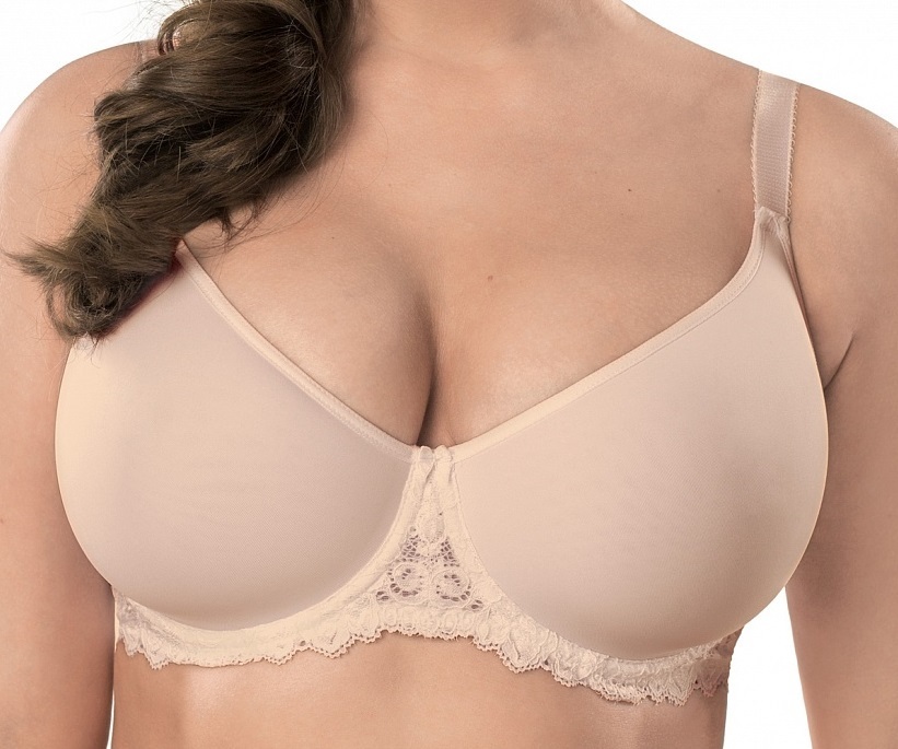Формованный бюстгальтер на каркасах, центральная и боковые детали из эластичного кружева.