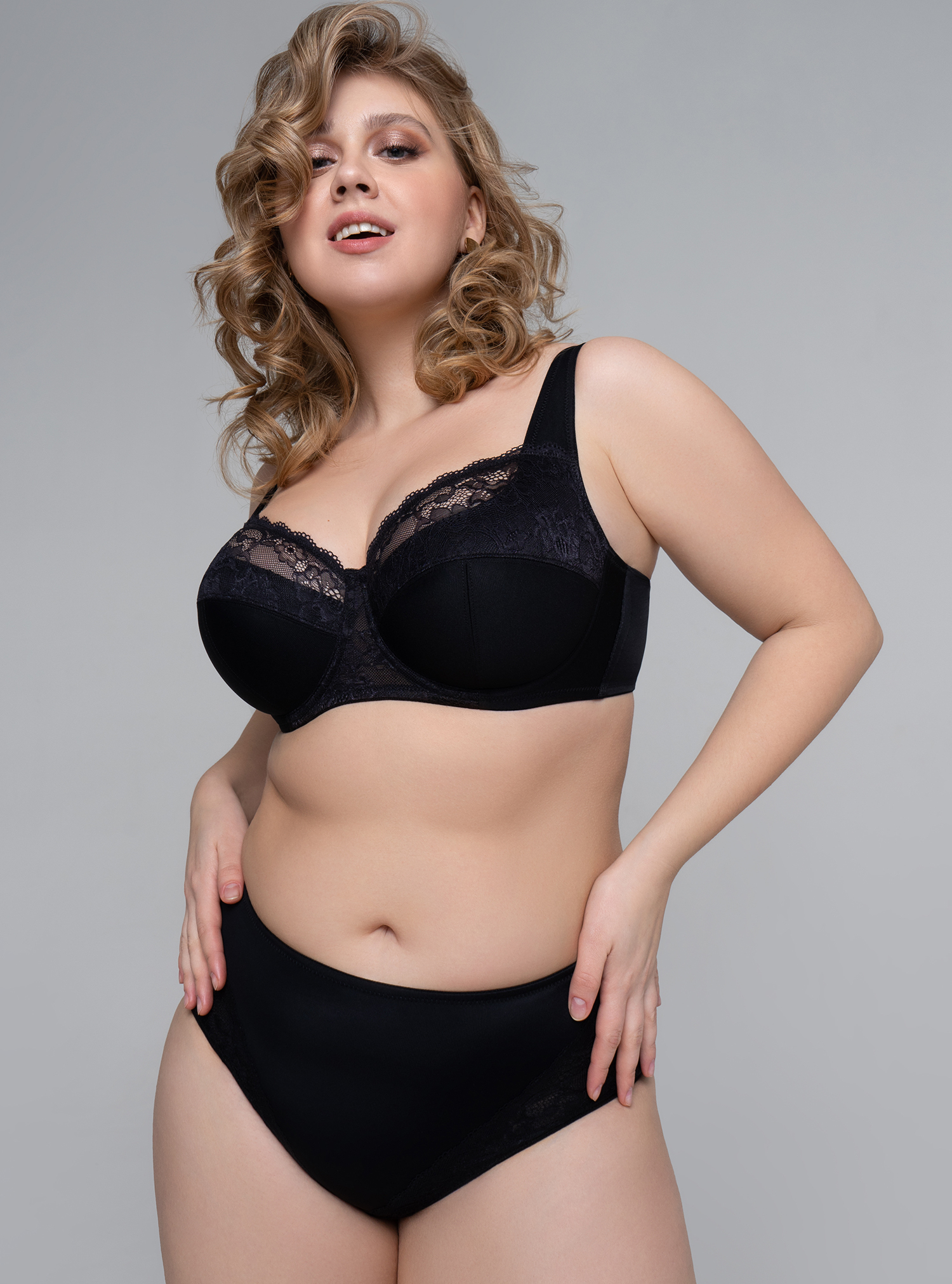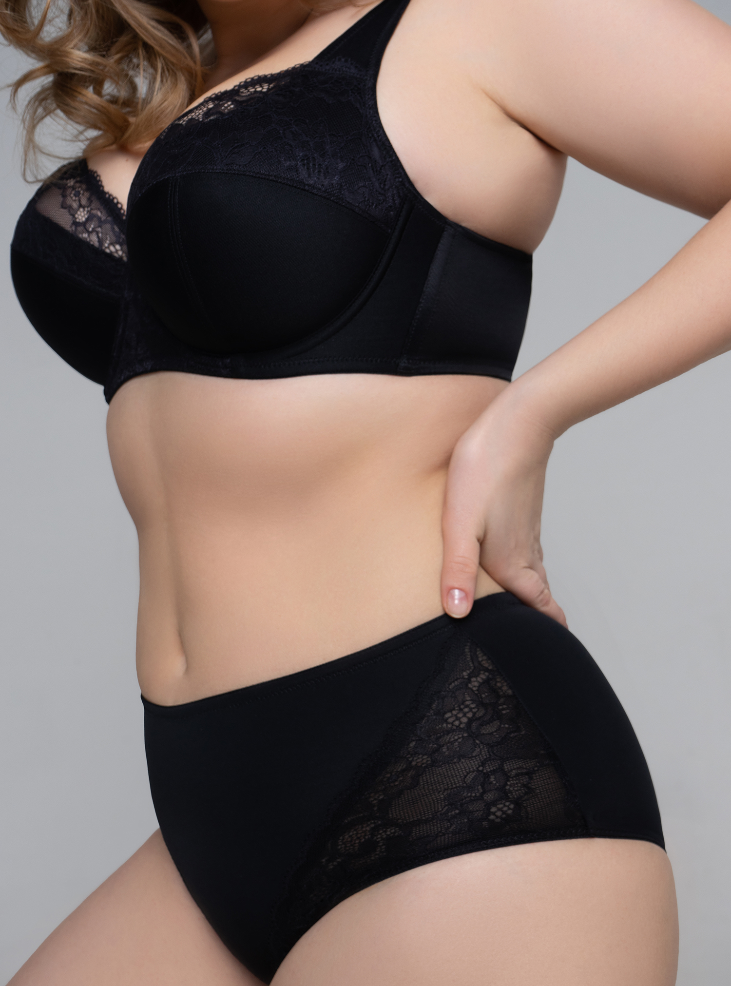 Комбинированная чашка из эластичного кружева и трикотажного полотна, на каркасах. Боковая деталь бюстгальтера усилена стержнями.